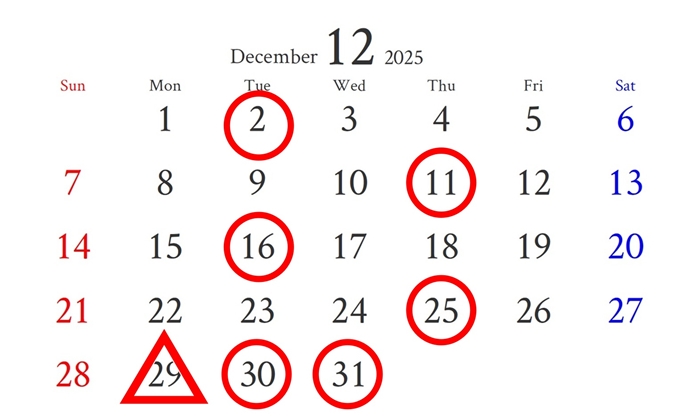 〇印:店休日 12/2(火)・12/11(木)・12/16(火)・12/25(木)・12/30(火)・12/31(水)