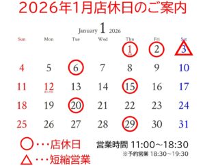 店休日:1/1(木)・1/2(金)・1/6(火)・1/15(木)・1/20(火)・1/29(木)