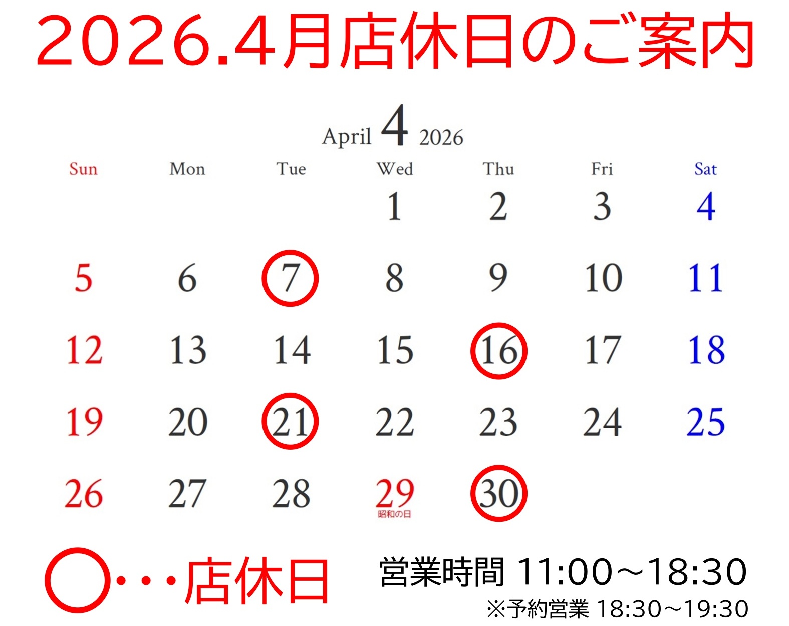 店休日 4/7(火)・4/16(木)・4/21(火)・4/30(木)